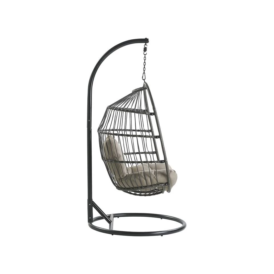 Ronde hangstoel met stalen frame voor binnen en buiten, inclusief kussens. Het opvallende ontwerp van deze hangstoel van robuust polyrotan en polyester zorgt voor een romantisch en zorgeloos vakantiegevoel op de veranda of in de slaapkamer. De gevlochten stoel is opgehangen aan een zware metalen ketting, die op zijn beurt is bevestigd aan een zeer stabiel stalen frame. Zo biedt de stoel rustgevende, subtiele schommelingen en laat je zweven op het comfortabele, waterbestendige zitkussen, zoals op een wolk in de lucht.