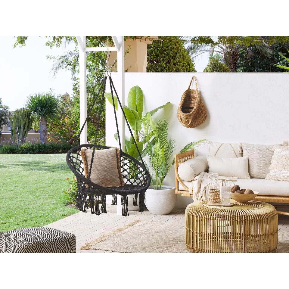 Schommel hangstoel. Met deze hangstoel kom je in een mum van tijd in een echte ontspanningsstaat. Leun achterover en geniet van het delicate schommelen, of het nu in je eigen slaapkamer, woonkamer of balkon is. De stoel heeft een sterk frame met een gevlochten, boho-stijl katoenen macramé zitting die een zorgeloos karakter geeft aan elke kamerindeling. Hang het op een plek naar keuze en creëer een mooie vrijetijdshoek.