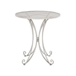 Bistrotafel van metaal. Deze opvouwbare ijzeren bistrotafel is perfect voor een klein balkon of terras. Ontworpen in een delicate en unieke romantische stijl, heeft het prachtig gebogen poten en ziet het er perfect uit in combinatie met stoelen in een vergelijkbare stijl. De verweerde look en grijze afwerking zorgen ervoor dat de tafel past bij elke buitenkussen en dekens.