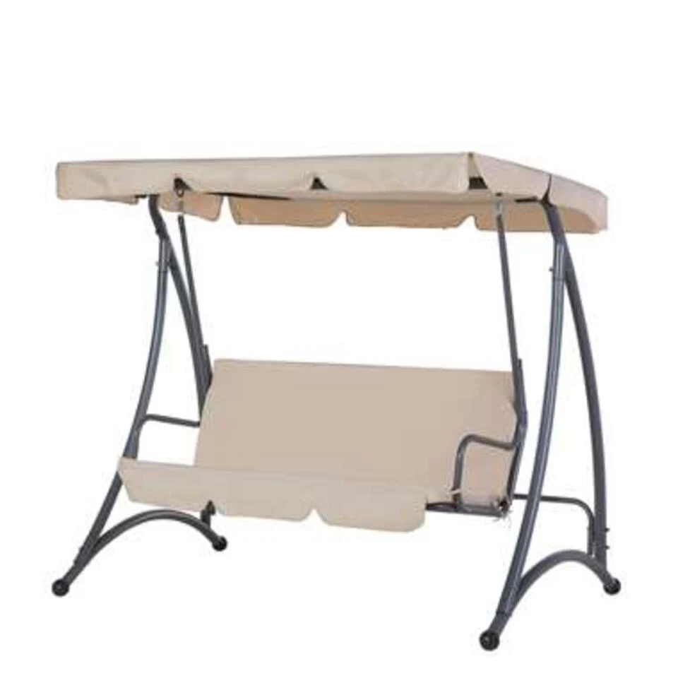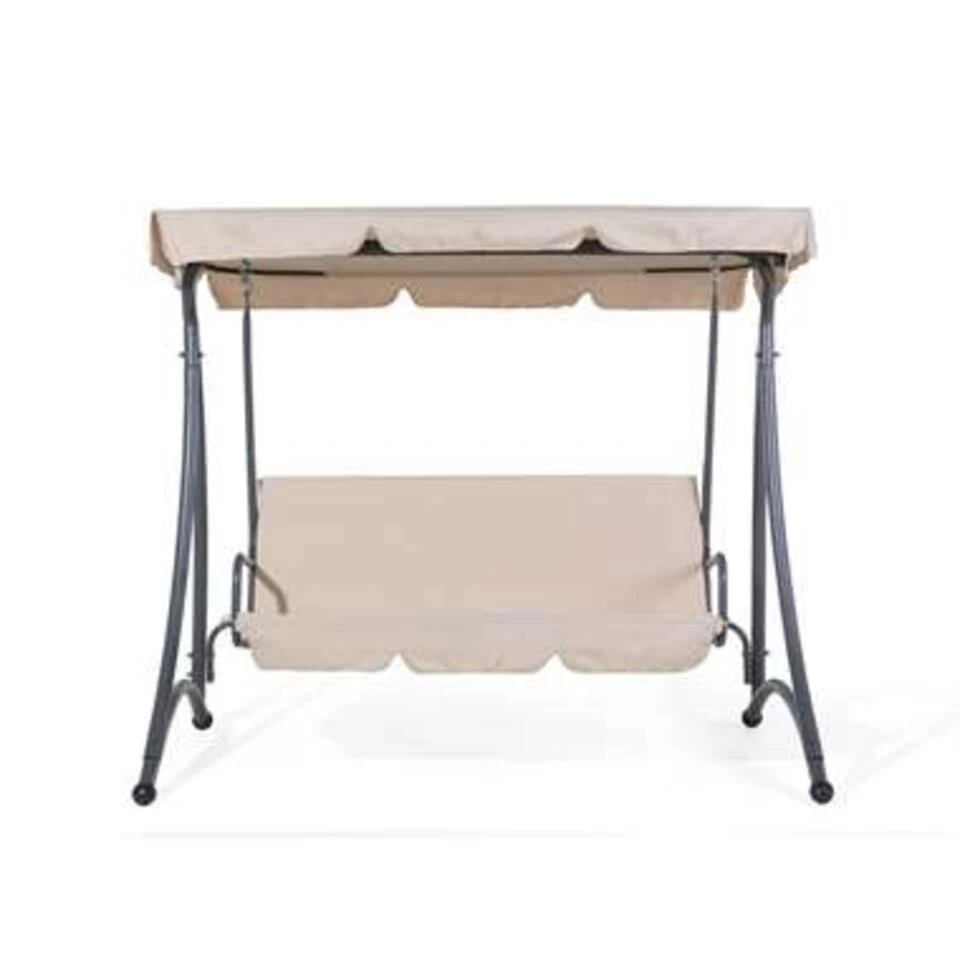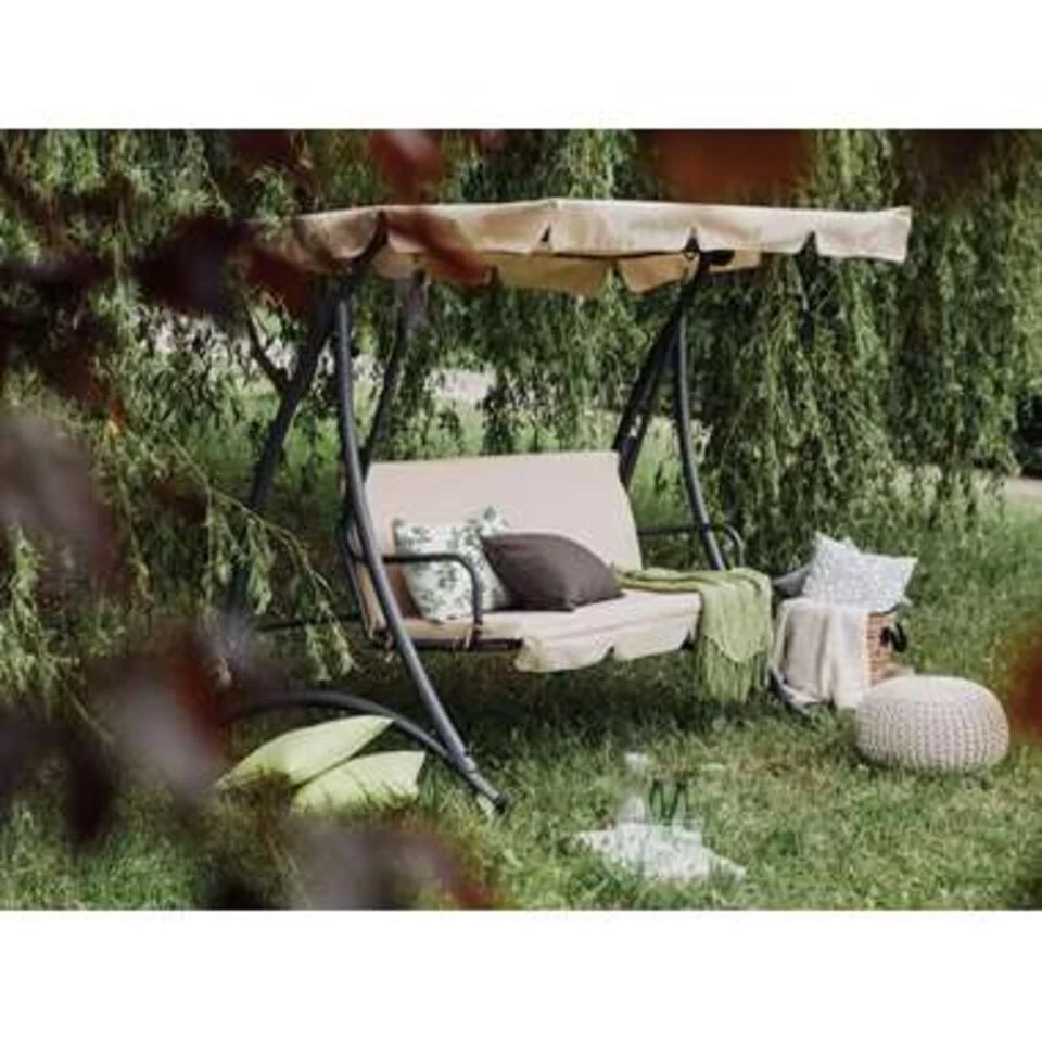 Schommelbank – beige – Temple. Deze schommelbank betovert door zijn zachte kleuren en zijn strakke vorm, die door het zonnedak wordt vervolmaakt. Deze is niet alleen op esthetische gronden toegevoegd, maar ook om je te beschermen tegen de sterke zonnestraling. Het zonnedak aan de schommel verzekert je van een koele schaduw, zo kun je aangenaam schommelen en ontspannen. Voor optimaal comfort zijn zitkussens toegevoegd, want deze hebben een bijzonder zachte vulling en zijn met stof bekleed. Opdat je je veilig voelt op de schommelbank, is hij voorzien van een bijzonder stabiel onderstel. Deze bestaat uit gepoedercoat staal, wat zeer robuust, weersbestendig en ook onderhoudsarm is. Wanneer je lekker wilt genieten van deze zomer, schaf dan beslist een schommelbank aan!