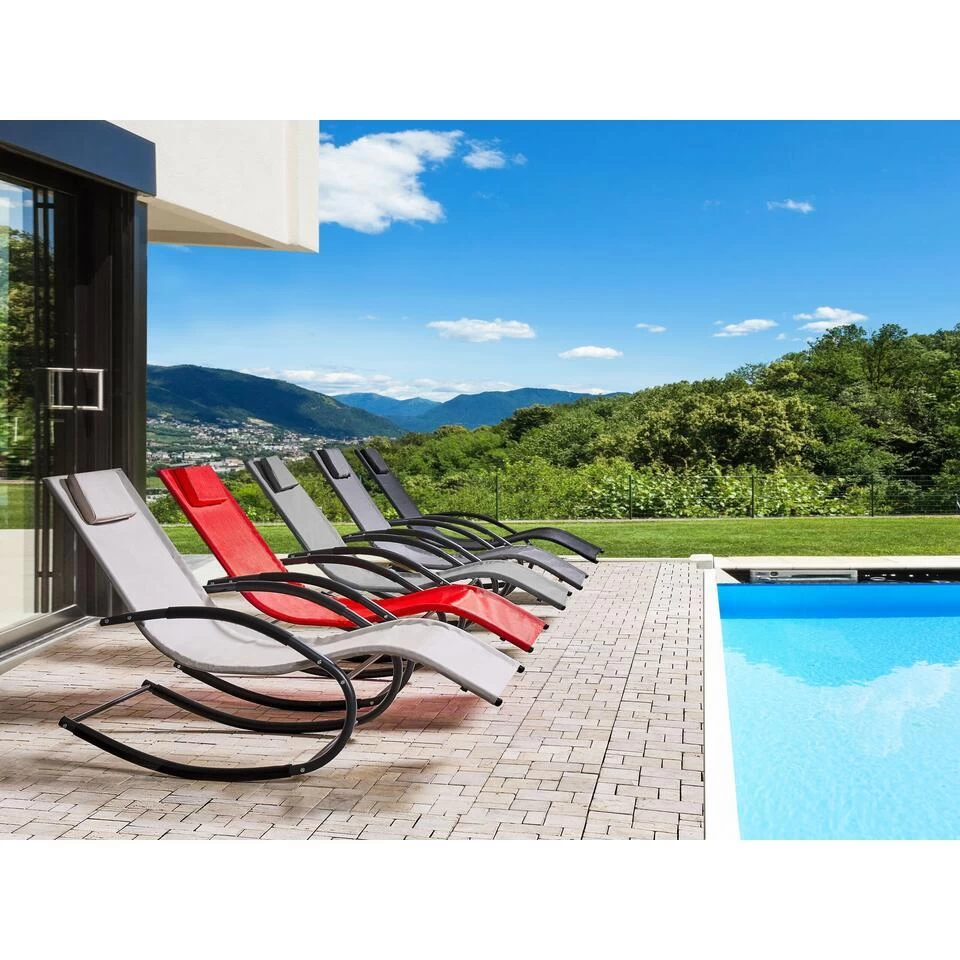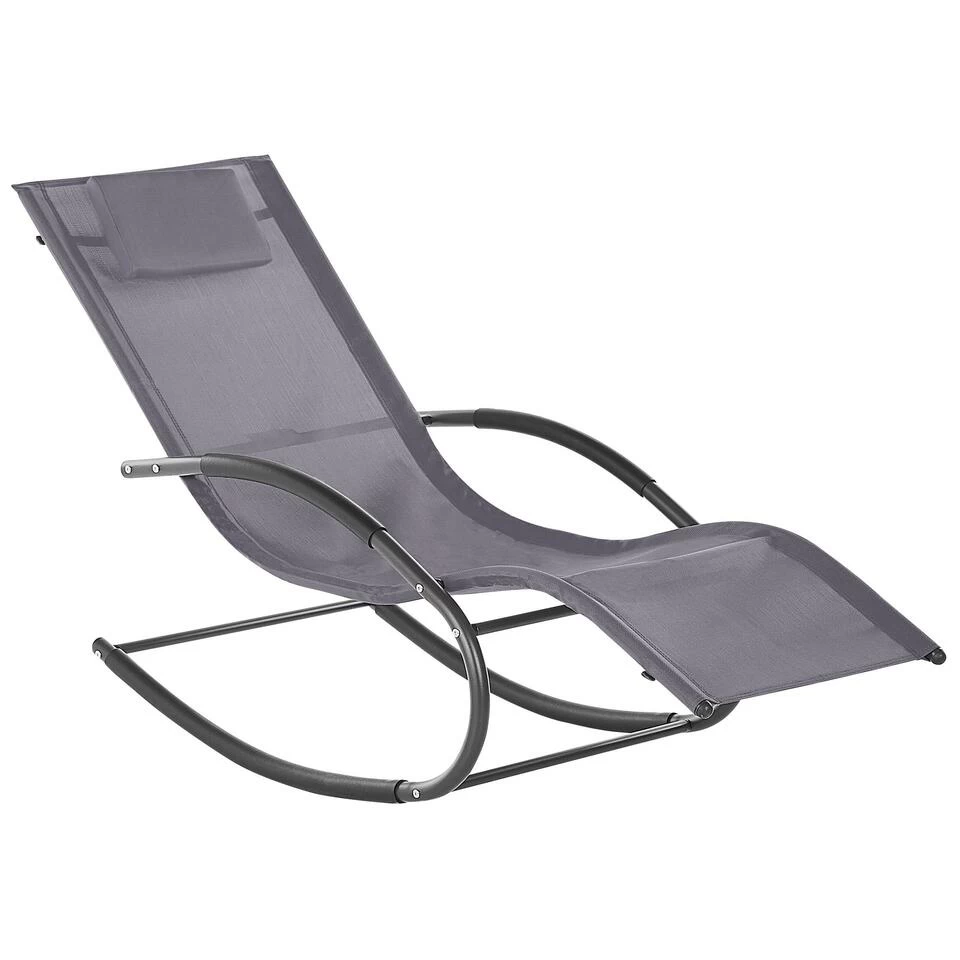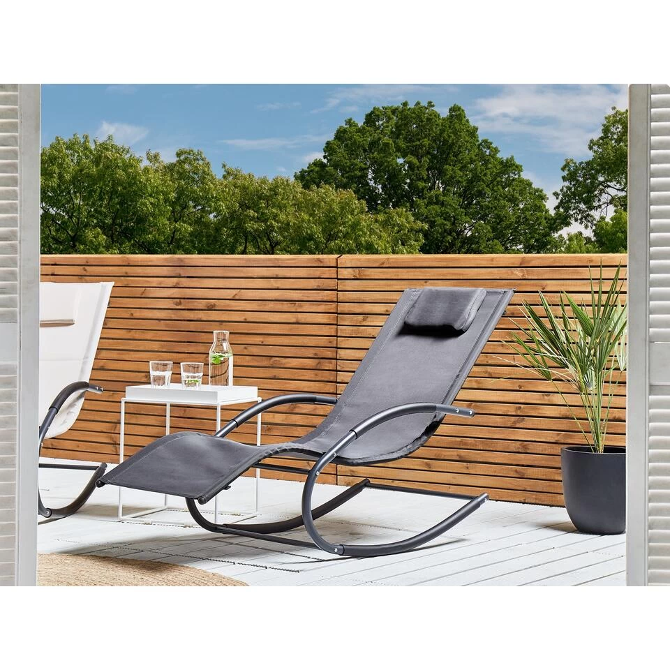 Exclusieve, grijs ligbed om in te schommelen. Dit ligbed onderscheidt zich door zijn eigentijdse ontwerp en is een prachtige aanvulling op elke tuin, balkon of terras. De zitting, gemaakt van een duurzame stof, heeft een gewatteerde hoofdsteun die extra comfort biedt. De tuinligstoel is gemaakt met stalen geleiders voor een soepele en ontspannende schommelbeweging.