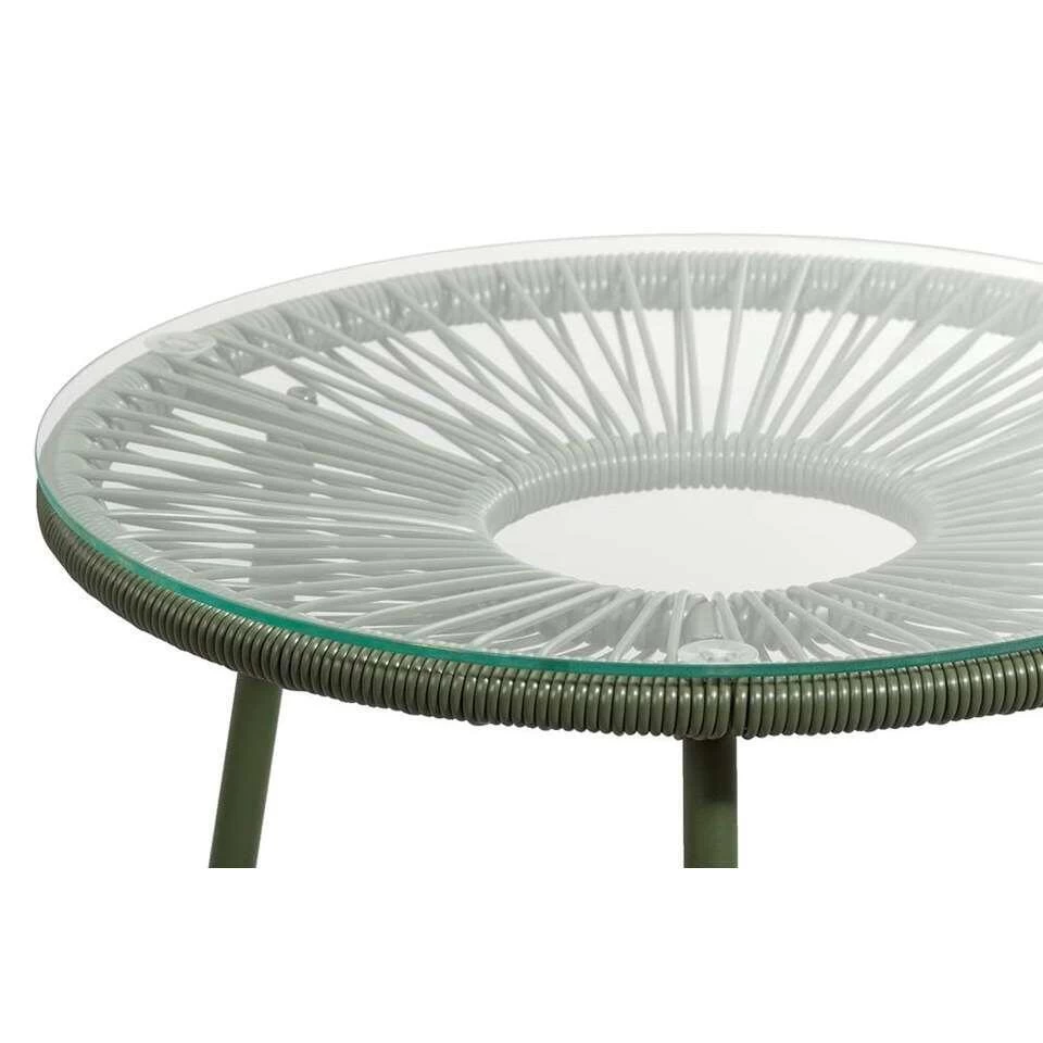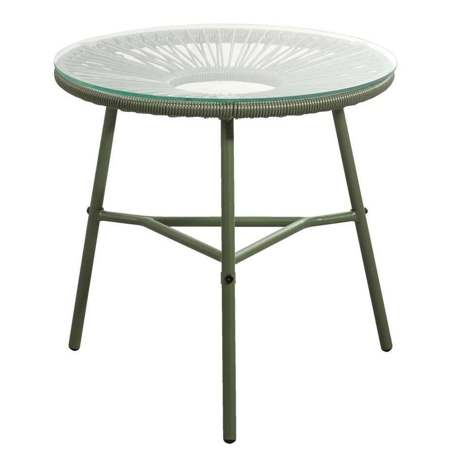 Dit ronde bijzettafeltje is gemaakt van metaal en kunststof. Het heeft een glazen blad, waardoor je veilig je lekkerste drankjes erop kunt zetten. Door dit onderhoudsvrije materiaal is dit bijzettafeltje geschikt voor zowel binnen als buitengebruik. De olijfgroene kleur past helemaal bij de natuurlijke/botanische stijl van dit seizoen. En zorgt tegelijkertijd voor kleur en warmte in je interieur. Het tafeltje is compact en handzaam, waardoor je het makkelijk kunt verplaatsen.