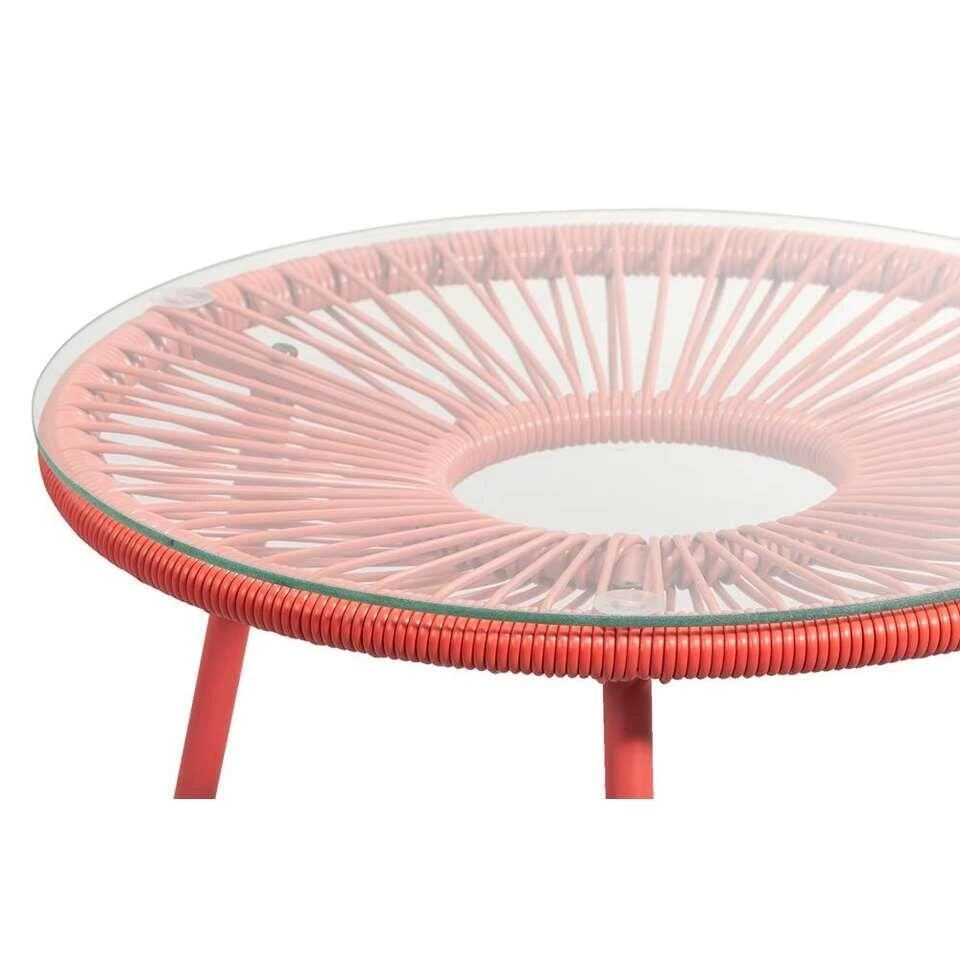Dit ronde bijzettafeltje is gemaakt van metaal en kunststof. Het heeft een glazen blad, waardoor je veilig je lekkerste drankjes erop kunt zetten. Door dit onderhoudsvrije materiaal is dit bijzettafeltje geschikt voor zowel binnen als buitengebruik. De terracotta kleur is de trendkleur van dit seizoen en zorgt voor kleur en warmte in je interieur. Het tafeltje is compact en handzaam, waardoor je het makkelijk kunt verplaatsen.